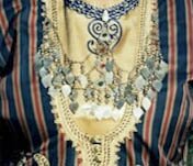 Tepeliki Tapla, Koursi A round ornament which sat at the top of a women's forehead, and tied under the back of the neck. There were three styles 1) Silver disk 2) Sown in patterns with gold string 3) With rows of gold coins comming into a centeral spiral