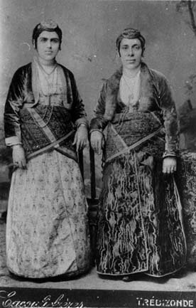 KondogounThe Kondogoun is a velvet jacket with fur inner linning. Normaly worn by the elderly women there was also the Akrogoun, which was more longer like a coat made of wool and again with fur inner lining. Gkamis The Gkamis is a very light cotton shirt worn under the Zipouna. This is many times is mistaken for a women's nightgown. Only worn by women in the Towns (mainly Trabzon) it is seen as a elegant piece of clothing. Comes in white or a creamy "bone" colour. It also may have different patterns on it.